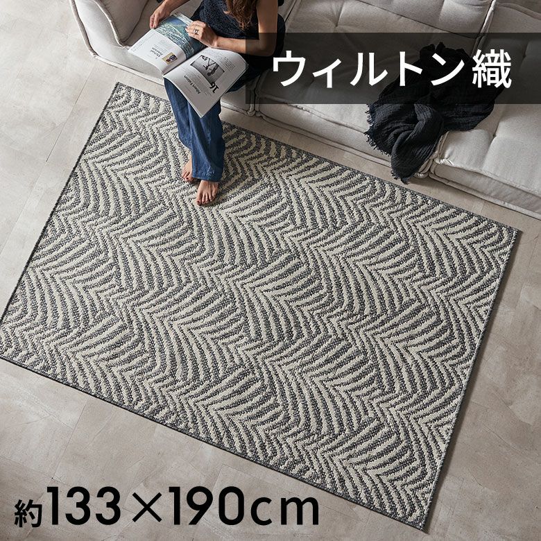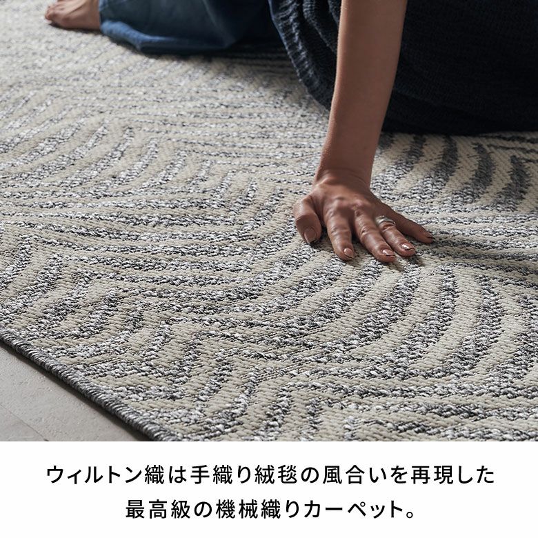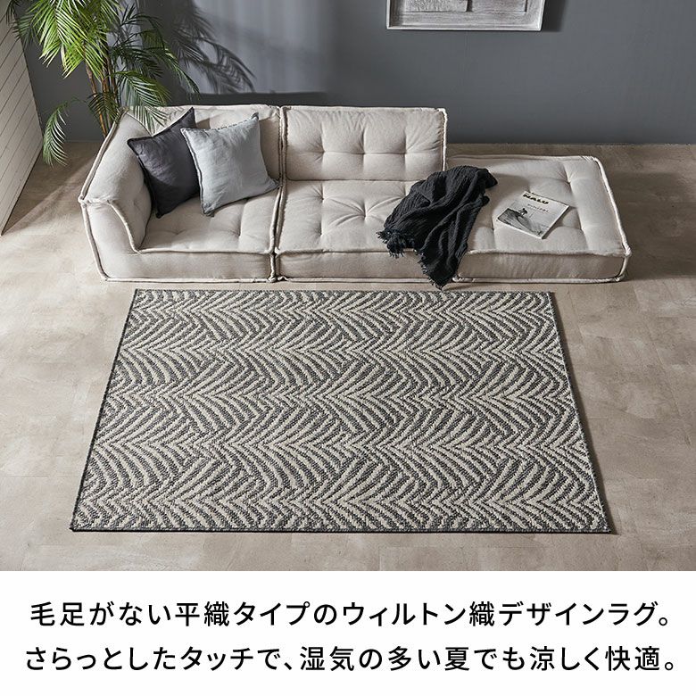 糸を贅沢に使ったウィルトン織は、密度が高くとても丈夫。素材には耐久性が高いポリプロピレンを使用しているため、長く愛用できます。平織タイプなのでさらっとしたタッチで、湿気の多い夏でも涼しく快適。通気性もよく、日々のお掃除も簡単です。床暖房も対応で、夏だけでなくオールシーズンお使いいただける、実用性に優れたラグです。