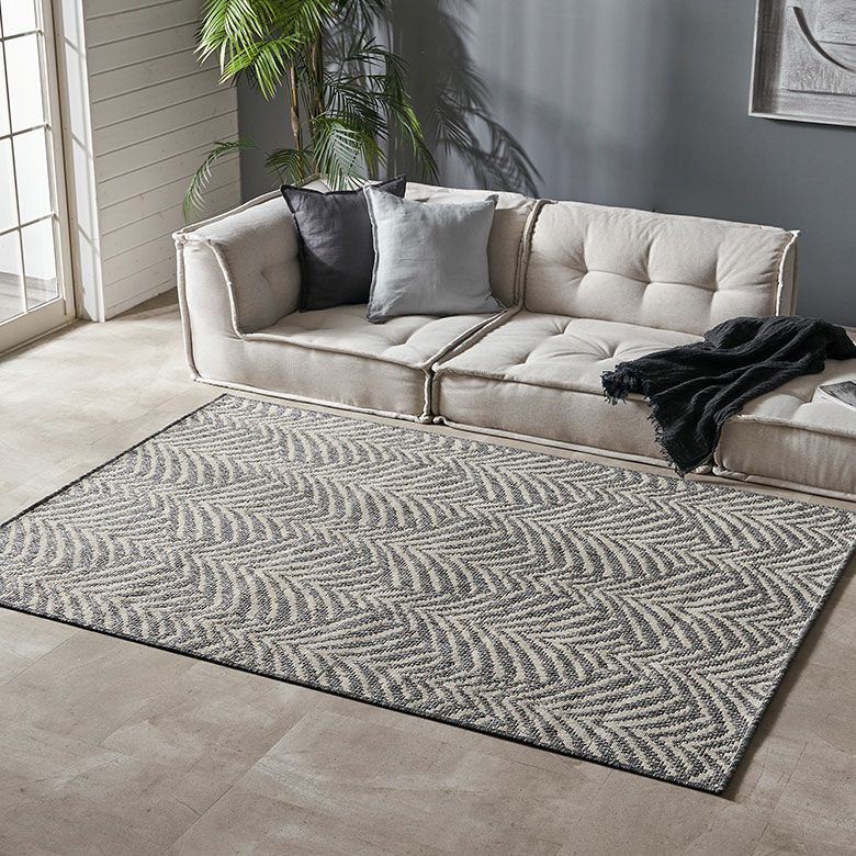 風にそよぐヤシの葉をイメージしたデザインラグ。毛足の色ではなく色糸による織りで模様を描いており、さりげない個性が光る一枚です。モノトーンの色味とシンプルな模様で、コースタルからモダンテイストまで様々なテイストのインテリアに合わせやすいので、デザインラグ初心者の方にもおすすめ。プリントではなく織りだからこそできる、高級感のあるデザイン表現が楽しめます。