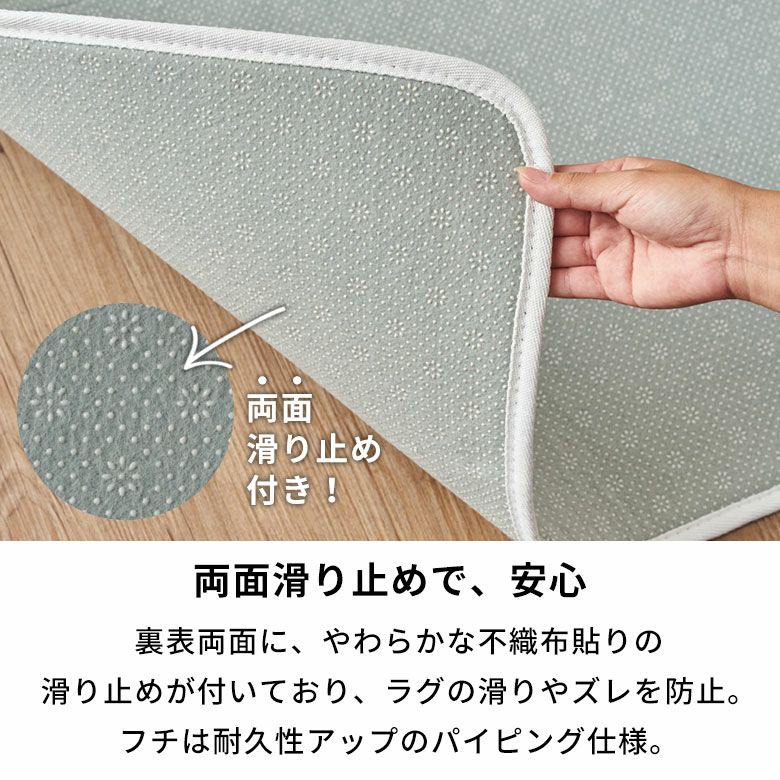 両面滑り止め付きだから、床・上に敷くラグのどちらも滑らず、ズレない設計なので