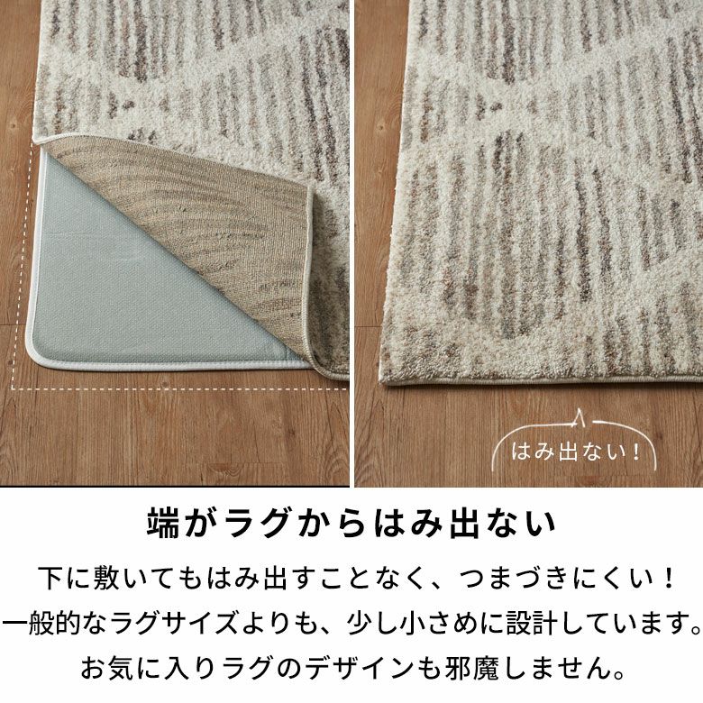 一般的なラグサイズの少し小さめ、端がラグからはみ出ないサイズ設計の