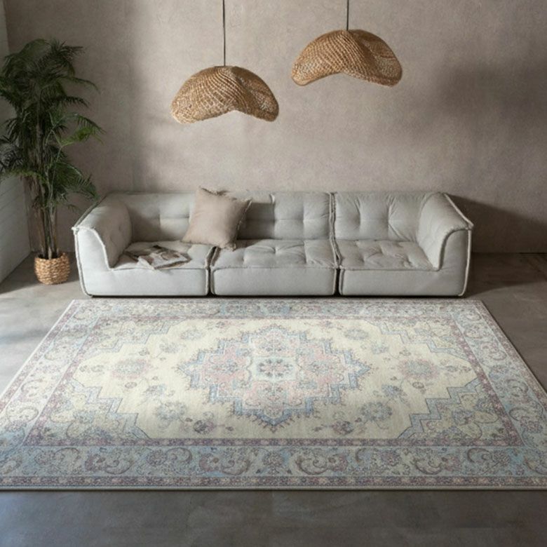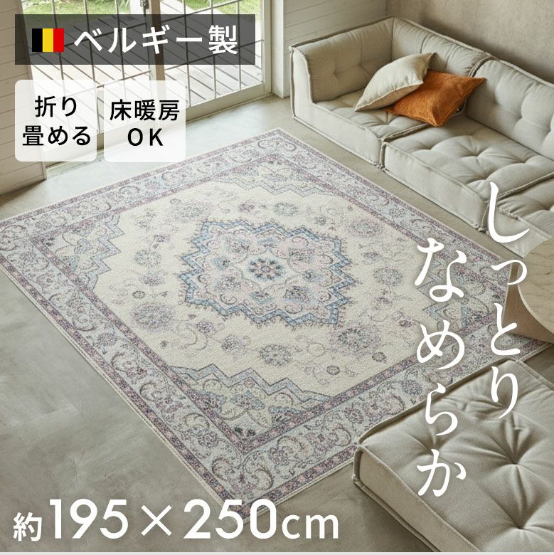 ヨーロッパらしい洗練されたデザインと美しい発色が魅力のRAGOLLEモケット織りラグ おしゃれで高級感あふれるヨーロッパ・ベルギー製モケット織りラグマット シルクのような肌触りの優美なパステルカラーが咲くナチュラルなかすれが素敵なビンテージ風メダリオンデザイン ホットカーペット対応&薄手で軽量 夏もOKのオールシーズン用 / 約195x250cm(84390)