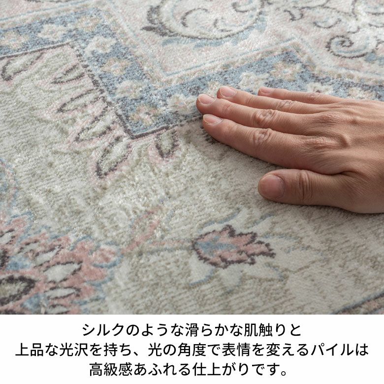 人絹(アーティフィシャルシルク)とも呼ばれる光沢のある上質な見た目と柔らかなタッチ感に加え、光の角度で表情を変えるパイルは精巧なデザイン表現を可能にし、ニュアンスカラーも美しく再現。短い繊維を撚り合わせた紡績糸で自然なふんわり感があり、踏み心地も快適です。使い始めは遊び毛が出ますが、徐々に落ち着きます。さらに、分解が早く環境負荷が少ない点も魅力で、上質さと環境配慮を両立した高級サステナブルラグです。