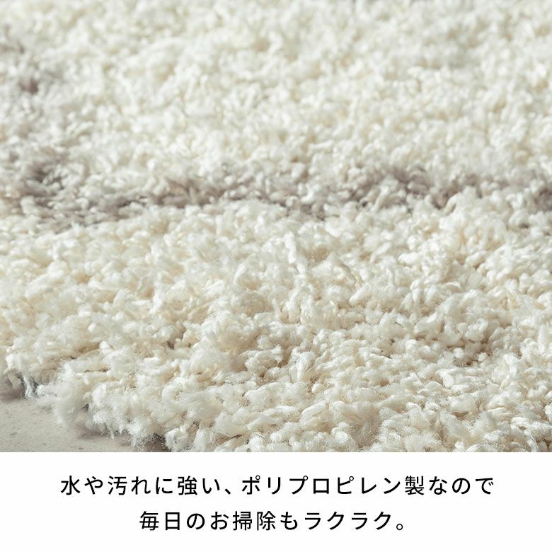 ノット数20,832のシャギーラグ。パイルの長さは約25mmで、ふんわり心地よい肌触り。素材は、繊維の中で最も軽く、摩擦に強いポリプロピレンを100%使用。水や汚れに強く、遊び毛も出にくいためお手入れも簡単です。