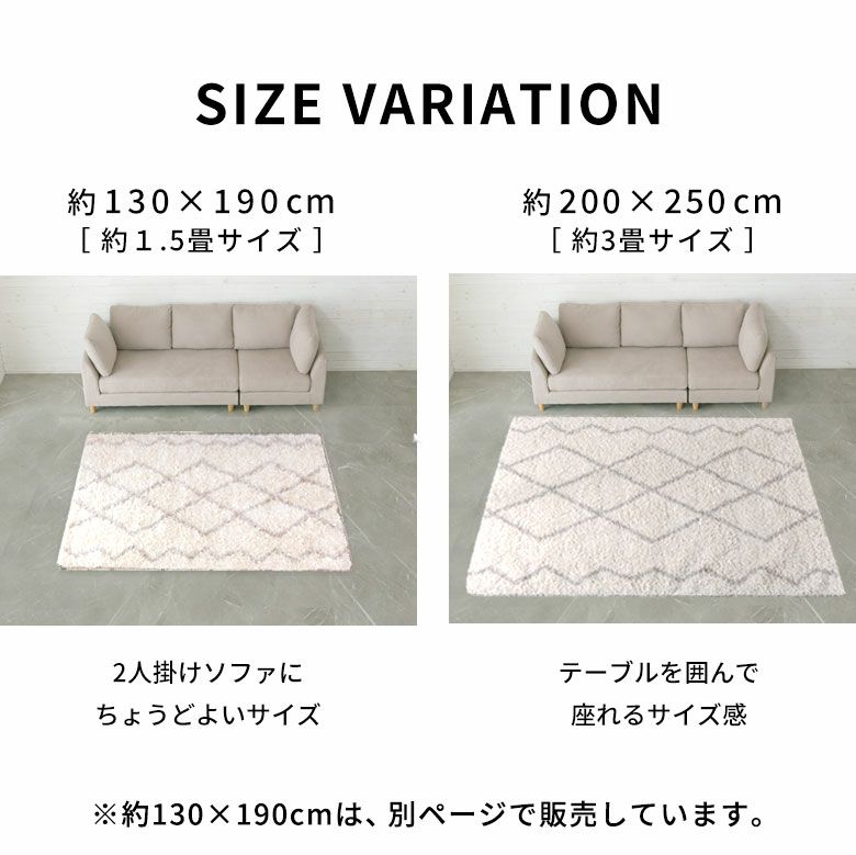 サイズは、家族や友人とテーブルを囲める200×250cmと、二人掛けソファにちょうどいい130×190cmサイズの2サイズ展開です。