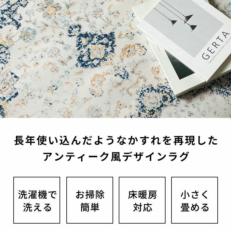 ヴィンテージラグの風合いを、“手軽に・清潔に”楽しめるラグマット。繊細な模様と深みのある色合いを転写プリントでリアルに再現し、本物のような重厚感と高級感を実現しました。