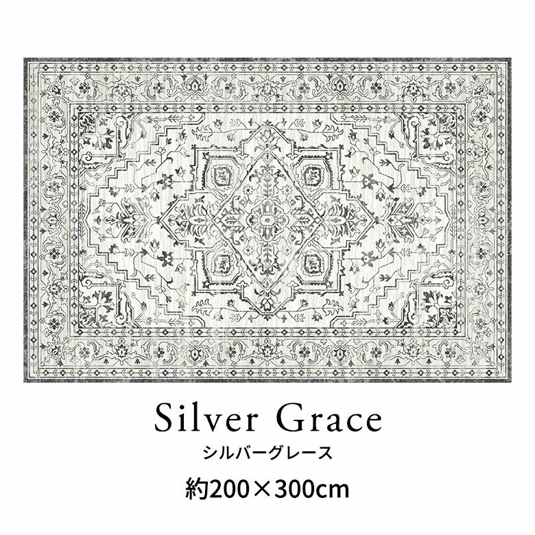 落ち着きと優雅さのあるグレーとホワイトで、草花や幾何学模様を描いた上品なデザイン。繊細なメダリオン柄が空間にリズムを生み出します。シックで洗練された印象を与え、モノトーンインテリアや北欧スタイルにもよくなじみます。
