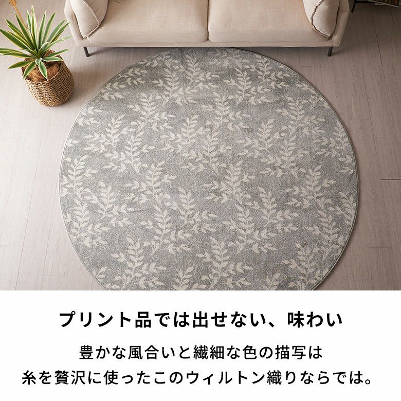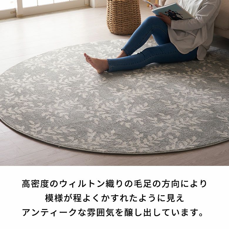 爽やかでボタニカルな雰囲気が漂う、リーフデザインのラグ。 ナチュラルなモチーフを取り入れることで お部屋の中でも自然を感じられ、リラックスできる空間に。 どこか懐かしさを感じる、優しくて淡いカラーリングも魅力。 ライトグレーとホワイトのバランスの取れた色合いが、どんなコーディネートにもマッチします。 お部屋のアクセントにぴったりな円形ラグは、ころんと優しい印象。 リビングやソファ前に敷くとおしゃれ度がぐんと増します。 高密度ウィルトン織りの魅力を活かし、かすれたようなアンティーク感を表現。 密度のぎゅっと詰まった柔らかい毛足で、季節を問わずオールシーズンお使いいただけます。 無地ラグでは出せない、アクセントにぴったりのラグです。 オリエンタルラグ一覧へ > デザインラグ一覧へ >