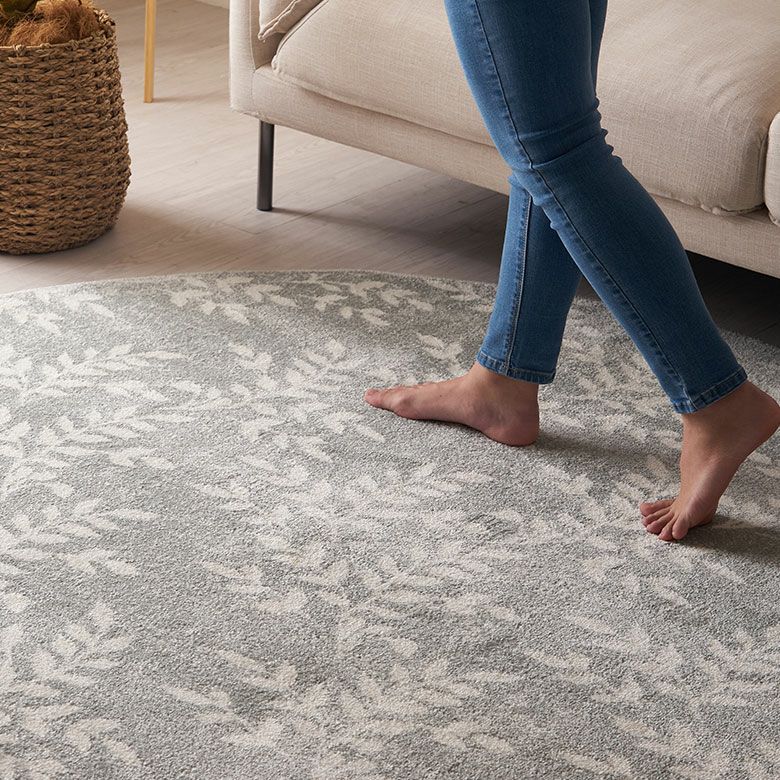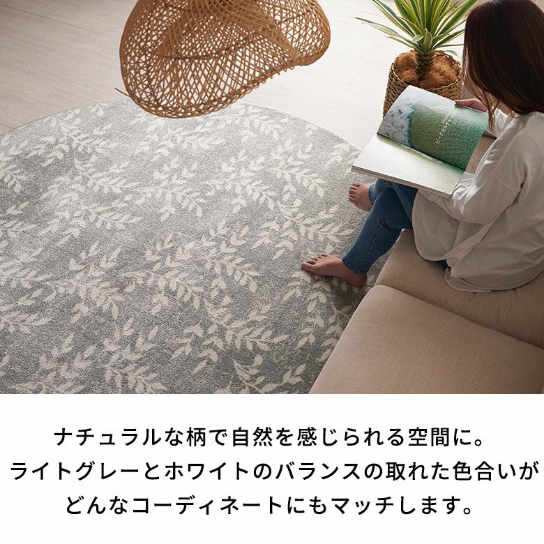爽やかでボタニカルな雰囲気が漂う、リーフデザインのラグ。 ナチュラルなモチーフを取り入れることで、 お部屋の中でも自然を感じられ、リラックスできる空間に。 どこか懐かしさを感じる、優しくて淡いカラーリングも魅力。 ライトグレーとホワイトのバランスの取れた色合いが、どんなコーディネートにもマッチします。 お部屋のアクセントにぴったりな円形ラグは、ころんと優しい印象。 リビングやソファ前に敷くとおしゃれ度がぐんと増します。 高密度ウィルトン織りの魅力を活かし、かすれたようなアンティーク感を表現。 密度のぎゅっと詰まった柔らかい毛足で、季節を問わずオールシーズンお使いいただけます。 無地ラグでは出せない、アクセントにぴったりのラグです。 オリエンタルラグ一覧へ > デザインラグ一覧へ >