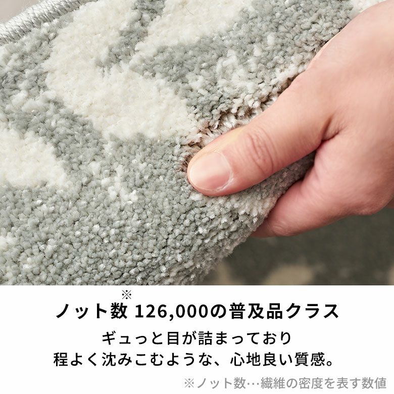 ノット数126,000の普及品クラス。 さらっとした肌ざわりの短めのパイルで、ぎゅっと繊維を詰めて織られています。 床暖房・ホットカーペット対応で、オールシーズン快適にお使いいただけます。