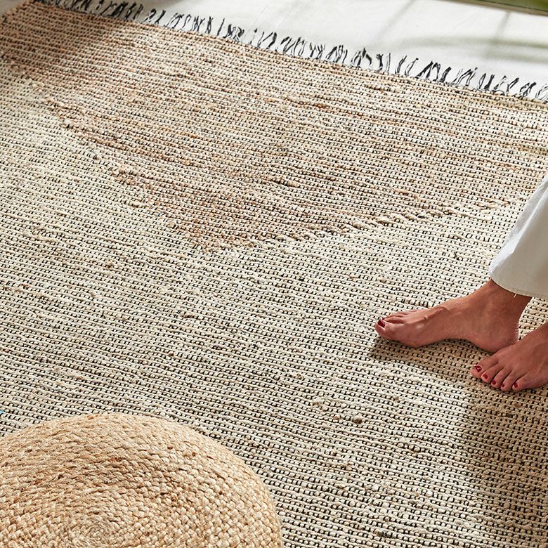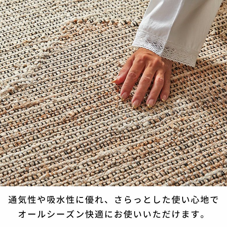 当店でも高い人気を誇る天然素材「ジュート」は通気性と吸水性に優れ、さらっとした使い心地が特徴!湿気が気になる時期も、ジメジメせずにさらりと快適にお使いいただけます。主に黄麻(こうま)というシナノキ科の植物の繊維を原料として作られるジュート素材は、とても成長が早く持続可能な天然資源として注目されているサステナブルな素材です。インドの職人が大型の織り機を用いて丁寧に作り上げたジュートラグは、自然素材の美しさとハンドメイドの温かみを空間にプラスします。