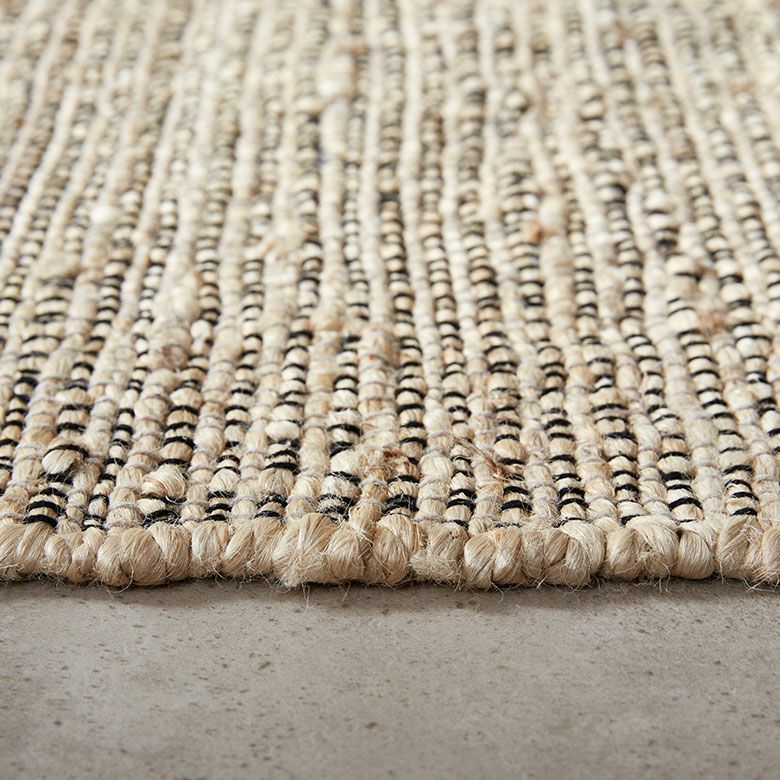 インドの職人が大型の織り機を用いて丁寧に作り上げたジュートラグ。天然素材のジュート100%で織られたハンドメイドラグのため、色の濃淡や風合いがそれぞれ異なる一点もの。ジュート素材の自然な風合いを生かしたベージュとライトブラウンのカラーが、お部屋にやさしい温もりを添えます。両サイドには黒のフリンジが付いており、ラグ全体のデザインを引き締めて上品な雰囲気を演出します。
