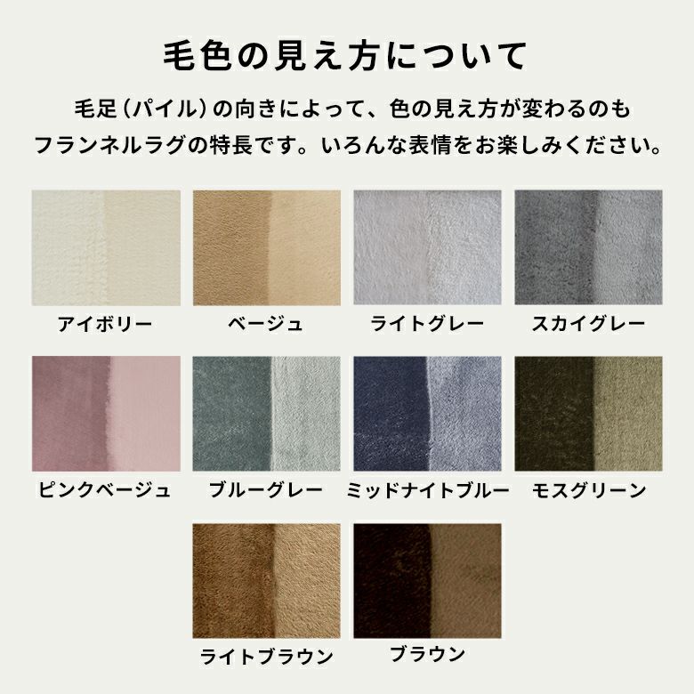 フランネルラグの特長です。いろんな表情をお楽しみください。