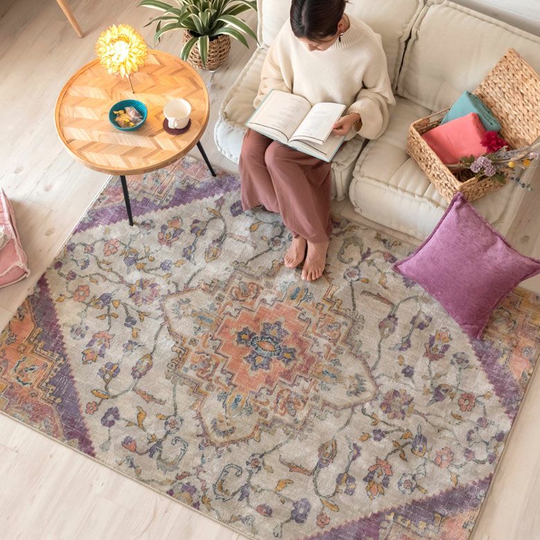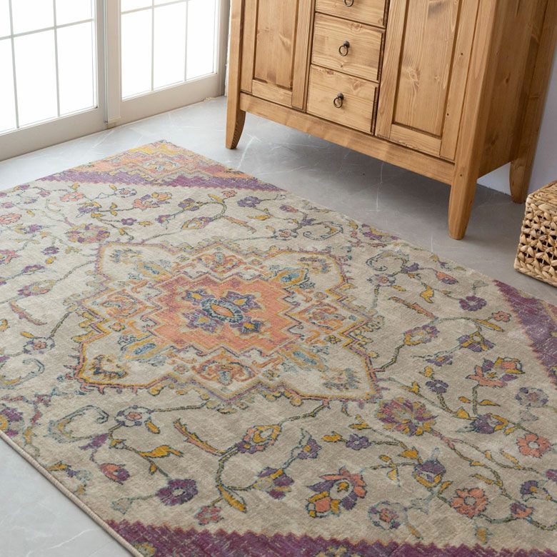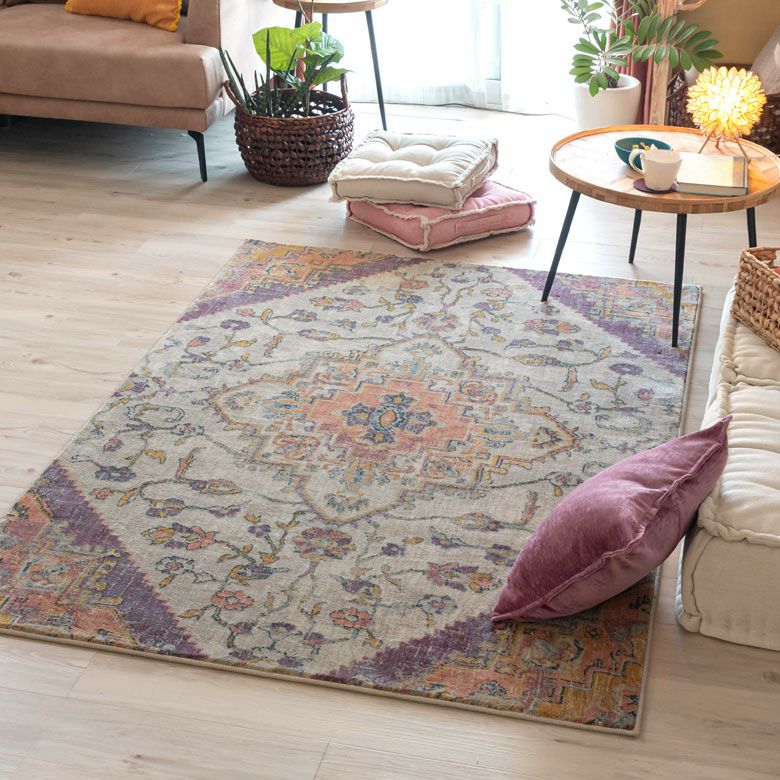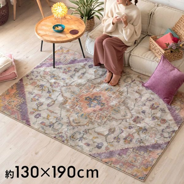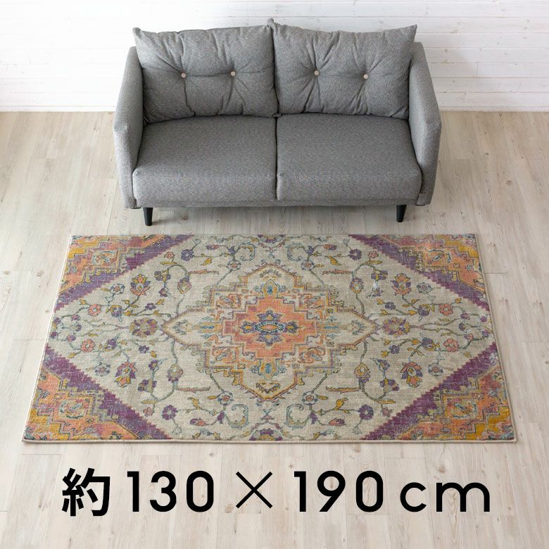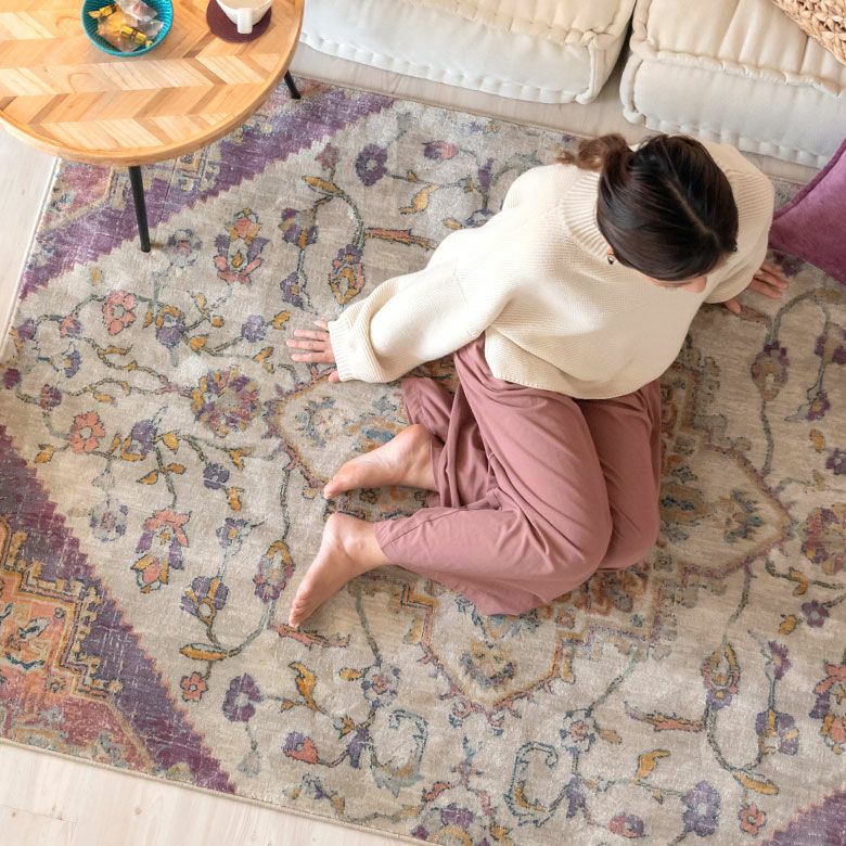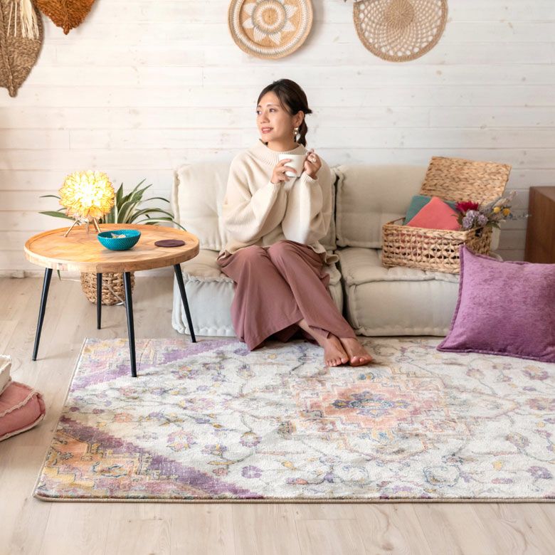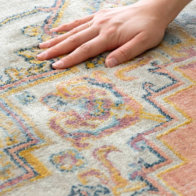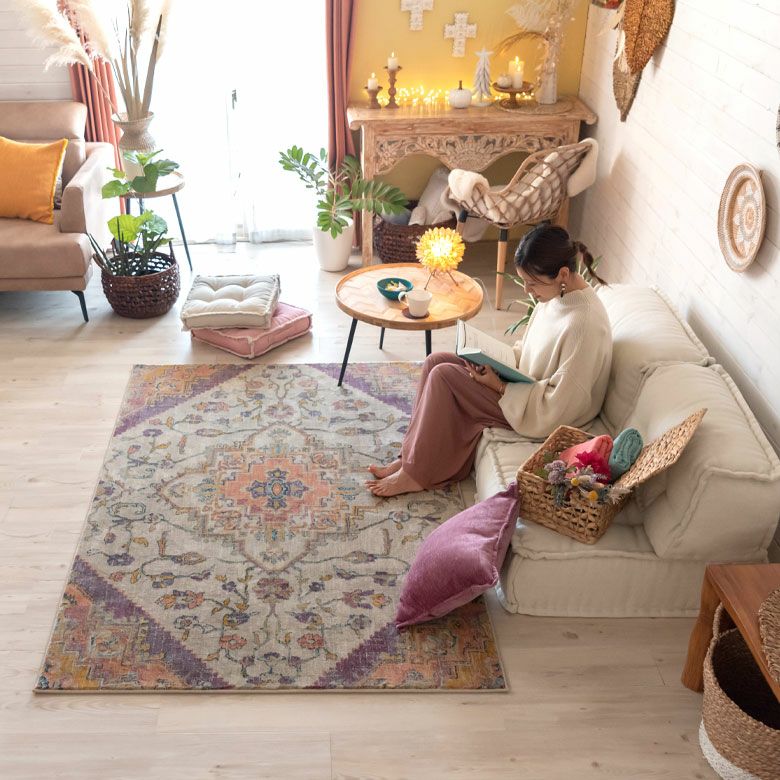 中央にあるメダリオンのシンボルと、華やかに舞うフラワー柄にひとめぼれ! エキゾチックなデザインラグで、お部屋を彩り豊かにアップグレード。 「高密度ウィルトン織り」の魅力を活かし、かすれたようなアンティーク感を表現しました。 エスニックからボヘミアン、モロッカンなど、幅広いスタイルでのコーディネートが楽しめそう。 短めの毛足ですが、ふんわりやわらかく心地よい感触。 リビングからダイニング、ベッドルームまで、そしてオールシーズン活躍すること間違いなしのラグカーペットです。