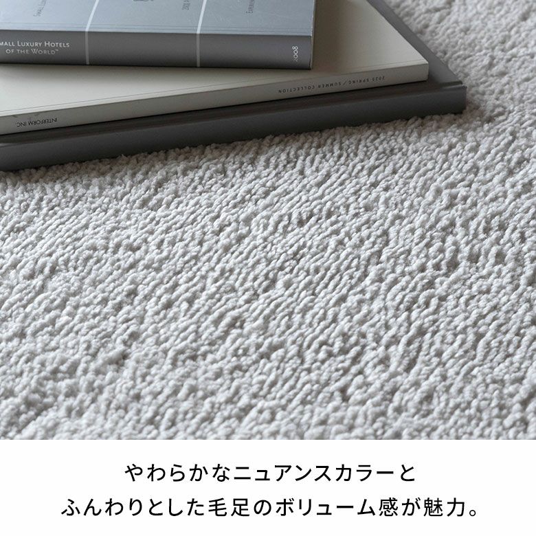 糸を贅沢に使ったウィルトン織は、密度が高くとても丈夫。素材は遊び毛が出にくく肌触りの良いポリエステルで、ウールのようなふわっと柔らかいソフトタッチ仕上げ。毛足約20mmのしっかりとしたボリューム感が魅力で、底つき感のないしっかりとした踏み心地を実現しています。床暖房にも対応しているので、オールシーズンお使いいただけます。