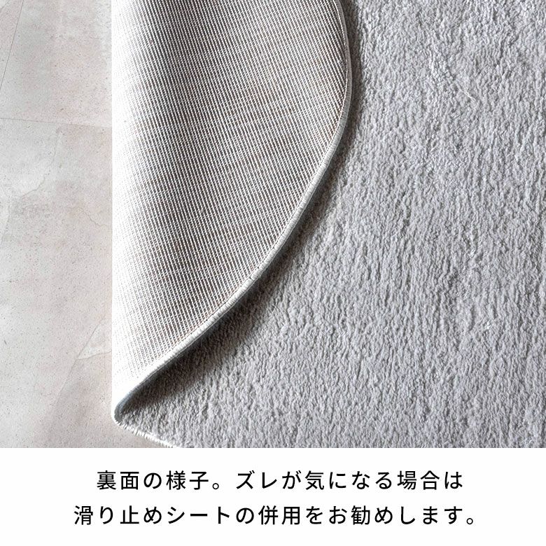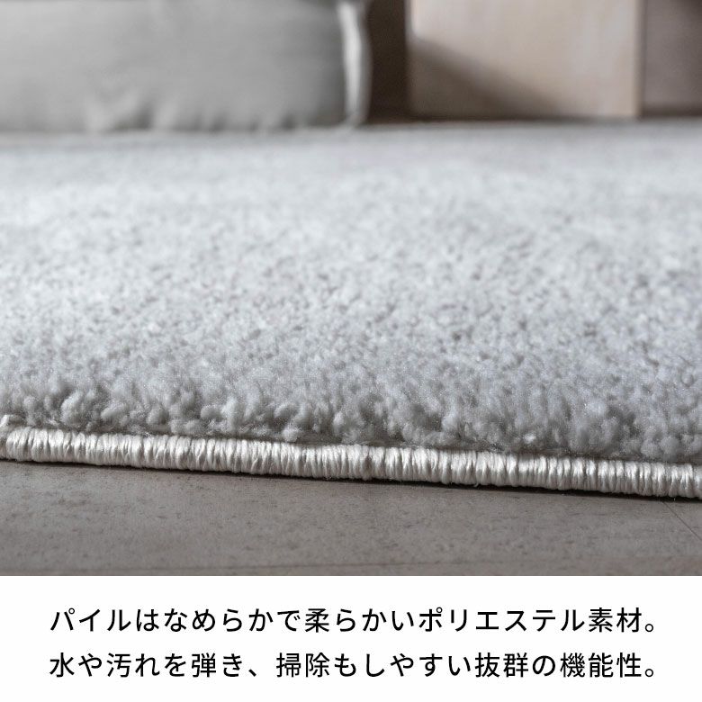 パイルにはポリエステル糸を使用。水や汚れを弾き、掃除もしやすい抜群の機能性。シワになりにくくタッチは柔らかで、ラグとしての実用性に優れています。また、長期間使用してもへたりにくいというメリットがあります。