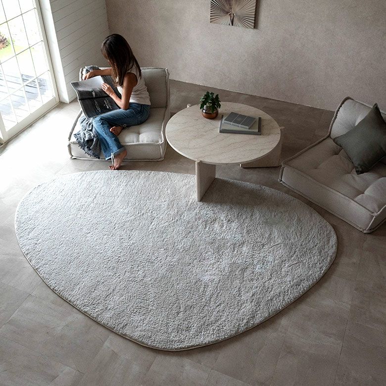 まるい三角形のような、やさしく湾曲した自由なフォルムが印象的なデザインラグ。自然の石や流木を思わせるような有機的な形は、まるで空間に“余白”をつくるように、インテリアに軽やかな抜け感を演出します。カラーは、やわらかなグレーを基調としたニュアンスカラー。光の当たり方や見る角度によって表情を変えるその微妙なトーンは、コースタル、モダン、北欧など幅広いテイストにマッチします。