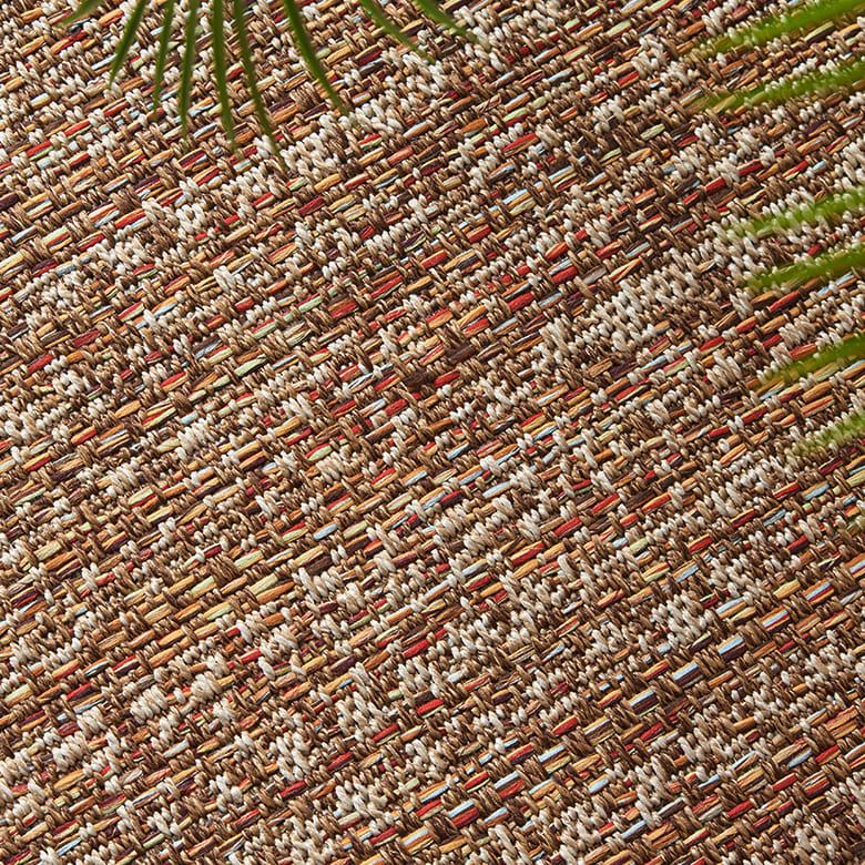 ベースカラーはブラウンで、アジアンからカントリーテイストなど幅広いインテリアに合わせやすい色味。レッド、イエロー、ライトブルー、ライトグリーンなどのミックスカラーの糸が織り込まれ、単色にはない味わいが魅力。プリントではなく織りだからこそできる、高級感のあるデザイン表現が楽しめます。