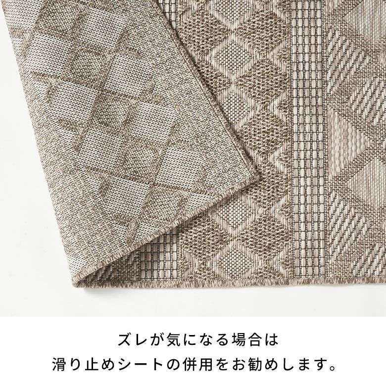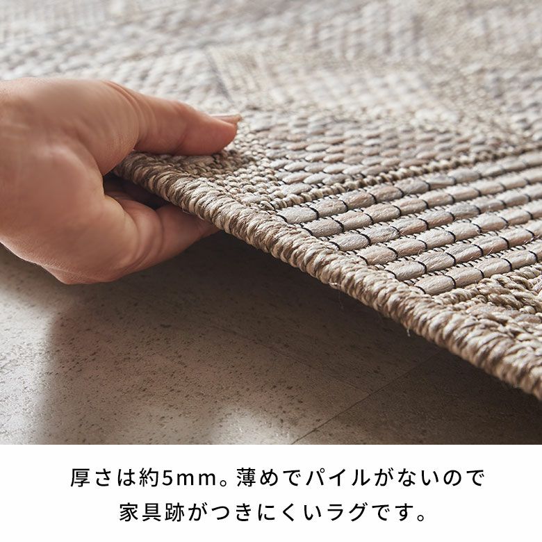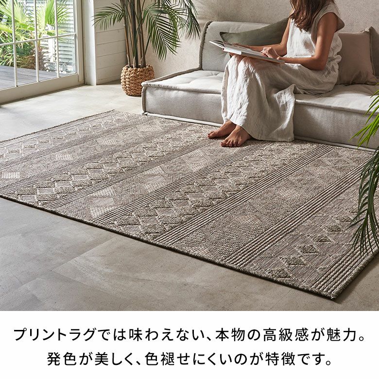 糸を贅沢に使ったウィルトン織は、密度が高くとても丈夫。素材には耐久性が高いポリプロピレンを使用しているため、長く愛用できます。平織タイプなのでさらっとしたタッチで、湿気の多い夏でも涼しく快適。通気性もよく、日々のお掃除も簡単です。床暖房も対応で、夏だけでなくオールシーズンお使いいただける、実用性に優れたラグです。