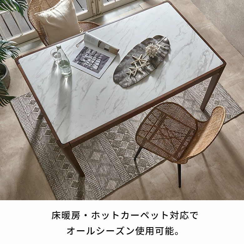 湿気がこもりにくくさらっとしたタッチが特徴で、夏でもべたつかず快適な肌触りをキープできます。春夏秋冬ずっと快適な上、床暖房・ホットカーペット対応なので模様替え不要です。