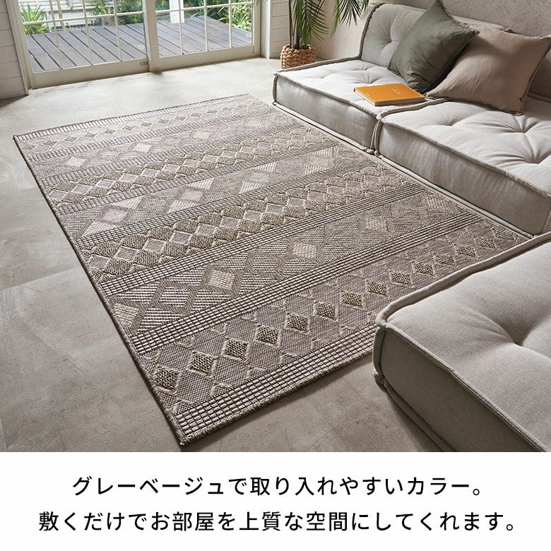 立体感のある織り方で、表面に模様を浮かび上がらせたデザインラグ。毛足の色ではなく色糸による織りで幾何学模様を描いており、確かな存在感のある一枚です。ライトグレーやベージュの色味でなじみやすく、アジアンから北欧モダンまでどんなインテリアにも合わせやすいので、デザインラグ初心者の方にもおすすめ。プリントではなく織りだからこそできる、高級感のあるデザイン表現が楽しめます。