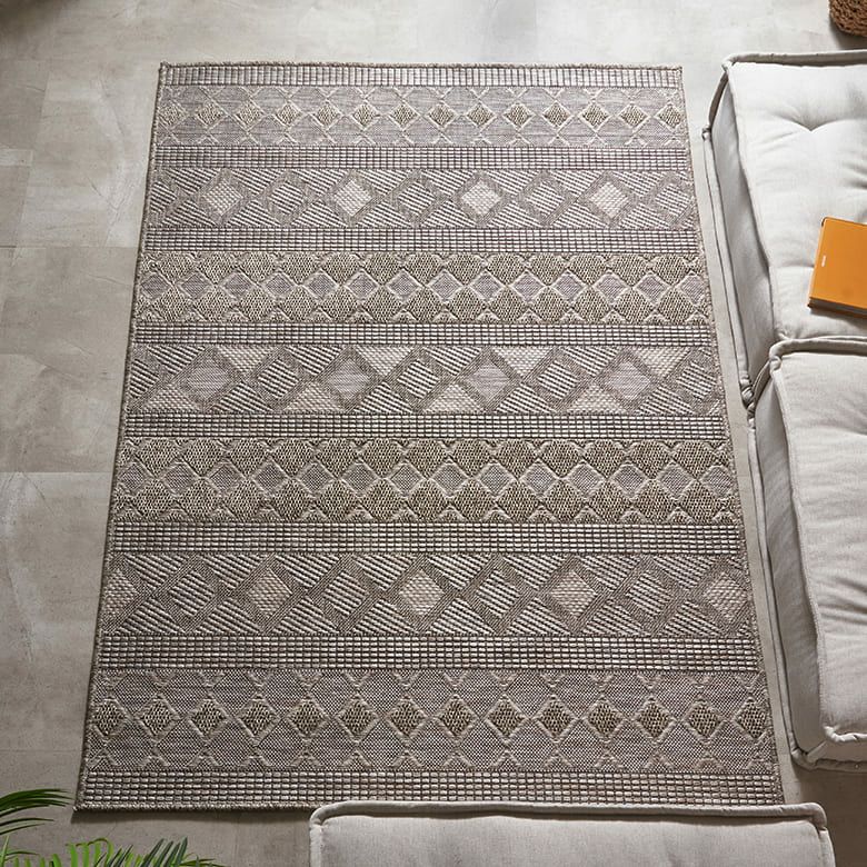 幾何学模様の繰り返しが民族調の要素にマッチ。色味が抑えられているので、他の派手なエスニック要素とバランスを取りやすいラグです。
