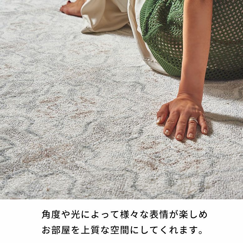 アンティーク調の家具や曲線のあるデザインのソファ・チェアにぴったり。木製の猫脚家具、ガラスや真鍮の装飾品と組み合わせると、よりラグの上品さが際立ちます。
