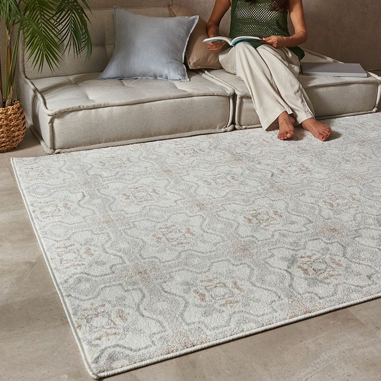 エレガントなモザイクタイルを思わせる幾何学模様に、やわらかなフラワーモチーフを組み合わせたデザインのラグ。伝統的なモザイク柄を淡く落ち着いた色合いで表現しました。軽やかでありながら上品な雰囲気で、アジアンリゾートからシャビーシックまで、幅広いスタイルにマッチ。ラグなら一枚敷くだけでタイルデザインを簡単に取り入れることができ、お部屋の印象をぐっと魅力的に変えてくれます。