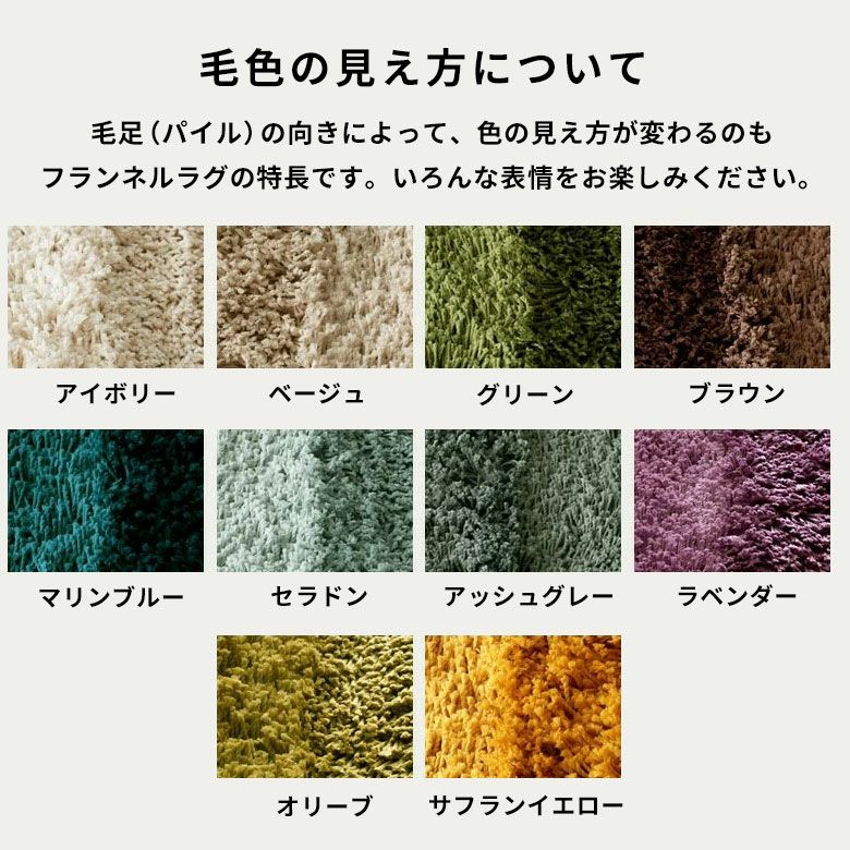 フランネルラグの特長です。いろんな表情をお楽しみください。