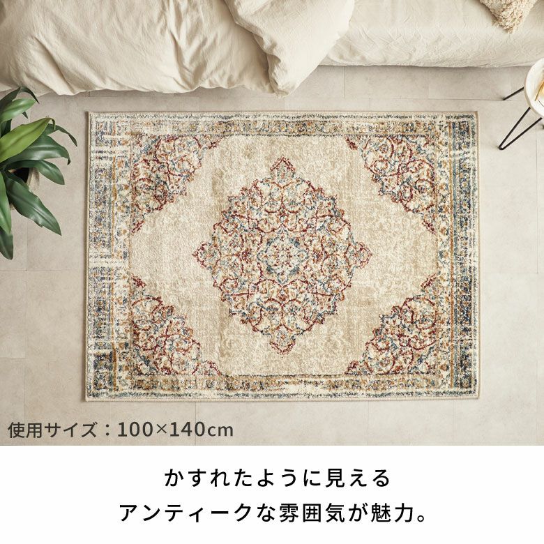 ヴィンテージラグの風合いを“手軽に・清潔に”楽しめる ペルシャ絨毯風ウォッシャブルラグマット!リビングをおしゃれに彩るオリエンタル柄 床暖房対応で年中快適 滑り止め付き 長年使いこんだようなかすれを再現したアンティーク風デザインのおしゃれなラグカーペット/約100x140cm 洗濯機で丸洗いOK 薄手で簡単お掃除&一年中使える 軽くて畳めてラクラク収納ラグマット [84399-a]