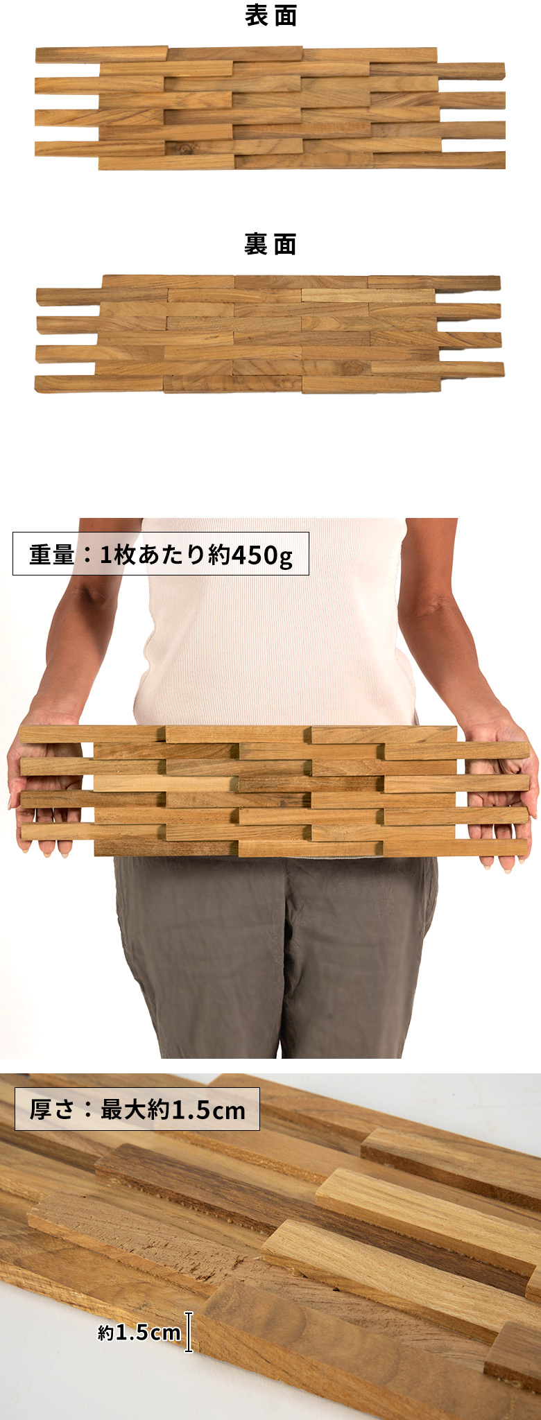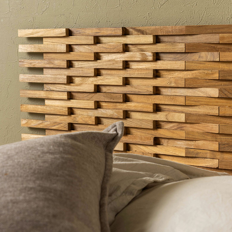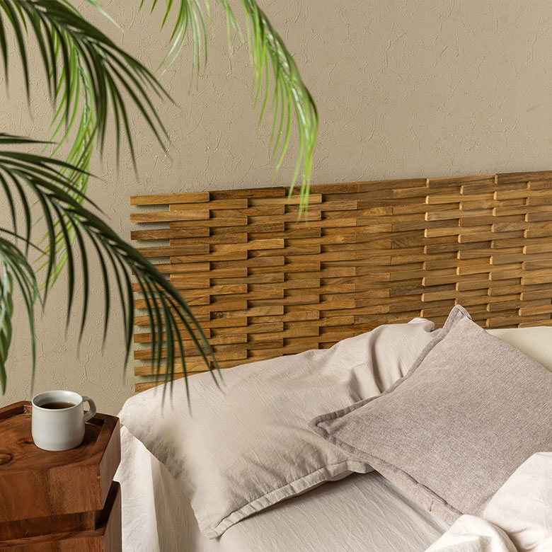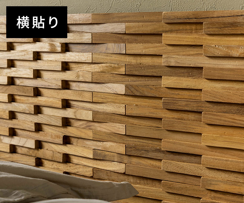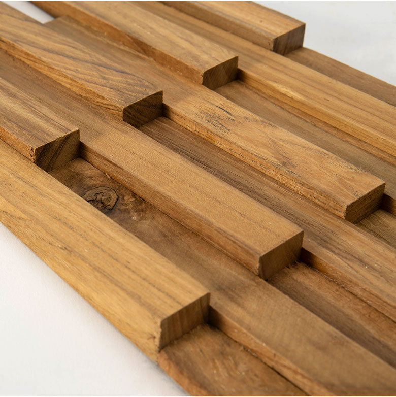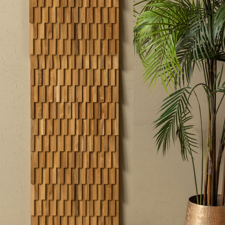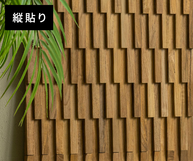 深みのある色合いと美しい木目が魅力の世界三大銘木「チーク材」を贅沢に使用したパズル式ウォールパネル。厚み約1.5cmの立体的な木片デザインが陰影を生み、壁面に高級感あふれる空間を演出します。無塗装仕上げならではの自然な手触りと経年変化を楽しめるほか、ツヤを抑えた上品な質感が落ち着いた雰囲気を添えます。