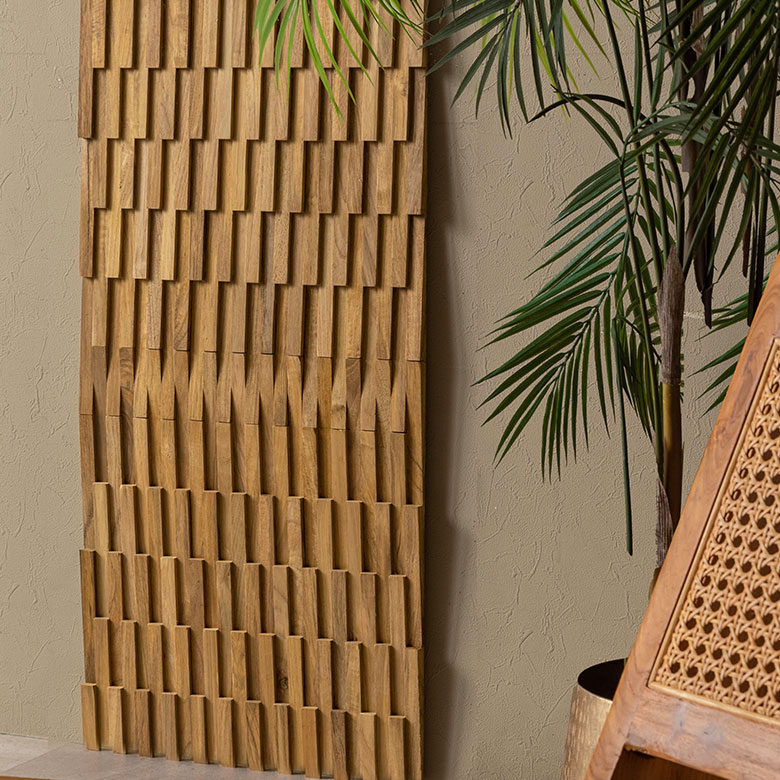 天然木チーク材の木片を組み合わせた凹凸のあるウォールパネルデザインは、動きのあるおしゃれな空間を生み出すだけでなく手触りでも楽しめる立体感が特徴。自然な陰影が生まれることで、空間全体が洗練された印象に。