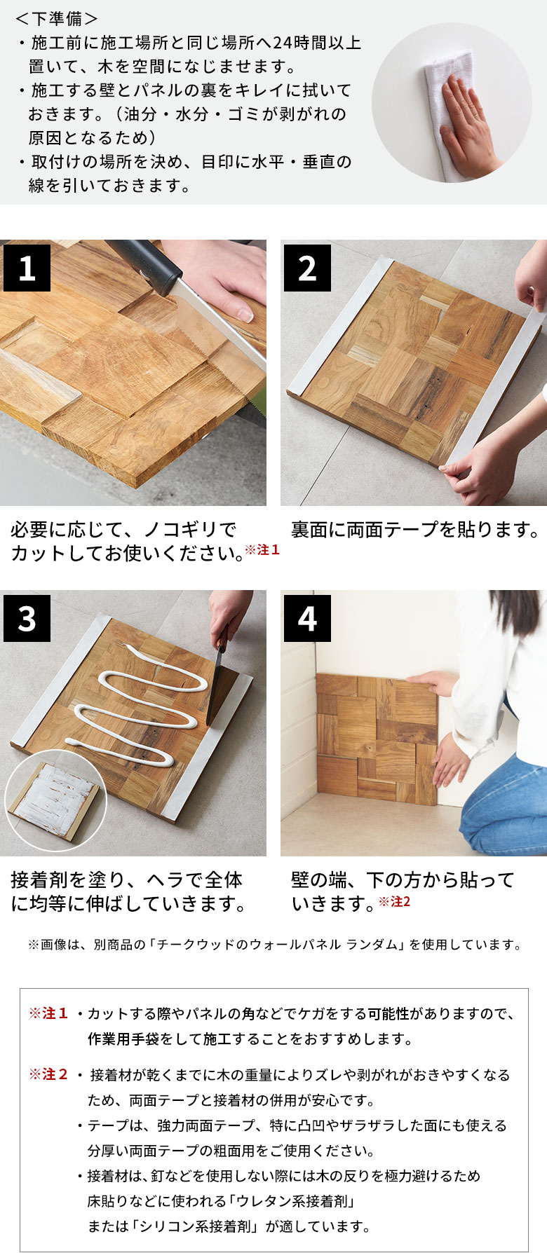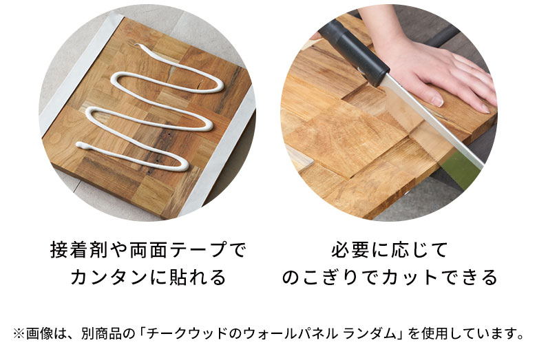 DIY初心者もOK!接着材や強力両面テープなどでペタッと貼るだけで簡単に本格的なDIYが可能。両端をジグザグにカットしたパズル状デザインで、貼り合わせても継ぎ目が自然に馴染み、プロの施工のような美しい仕上がりを実現します。気軽に壁をリフォームすることができます。