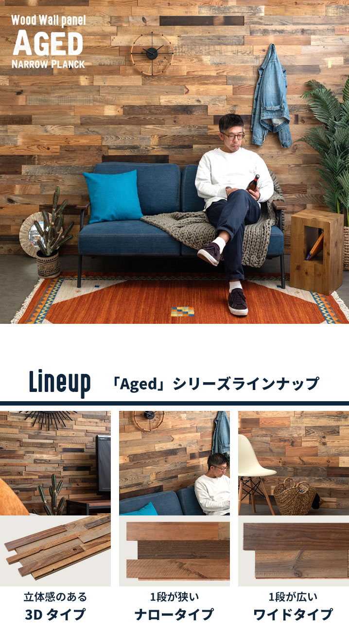 かつて古民家や小屋、足場板などで使われた、マツ・カラマツ・スギの古材を再生利用したウッドウォールパネル。 1枚のパネル内にそれぞれ色調・木目が異なる木材を組み合わせました。 色のランダム感や古材の質感が荒々しさを引き立て、インテリアに様々な表情をプラスできます。