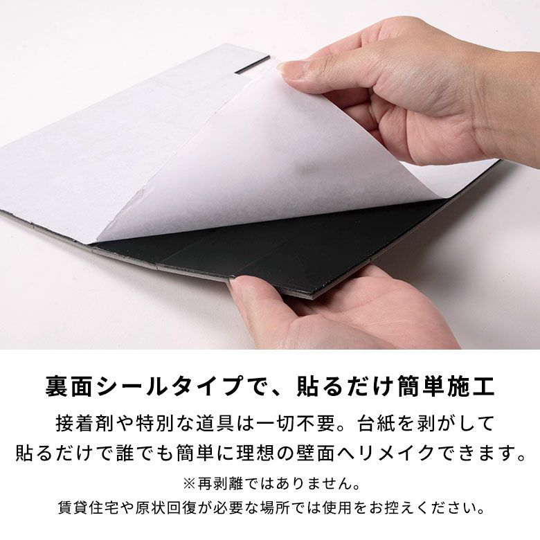 ぺたっと貼るだけ、 接着剤や目地材など、特別な材料は必要ありません。台紙をめくって貼るだけ! |