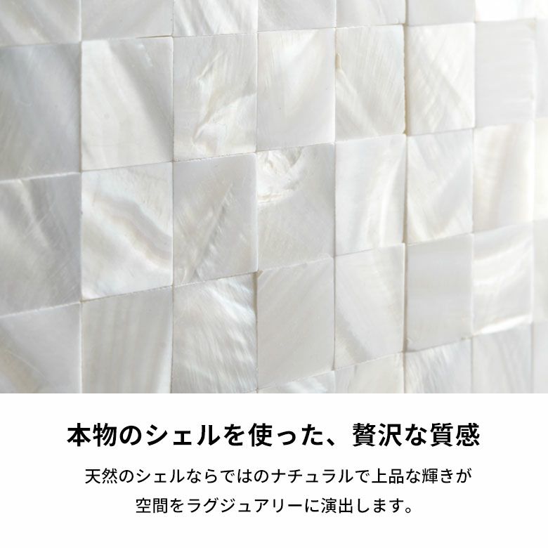 天然のシェルならではのナチュラルで上品な輝きが、 空間をラグジュアリーに演出します。 ※天然の貝殻を使用している為、自然な色むらと色幅がございます。 天然素材の味としてお楽しみください。