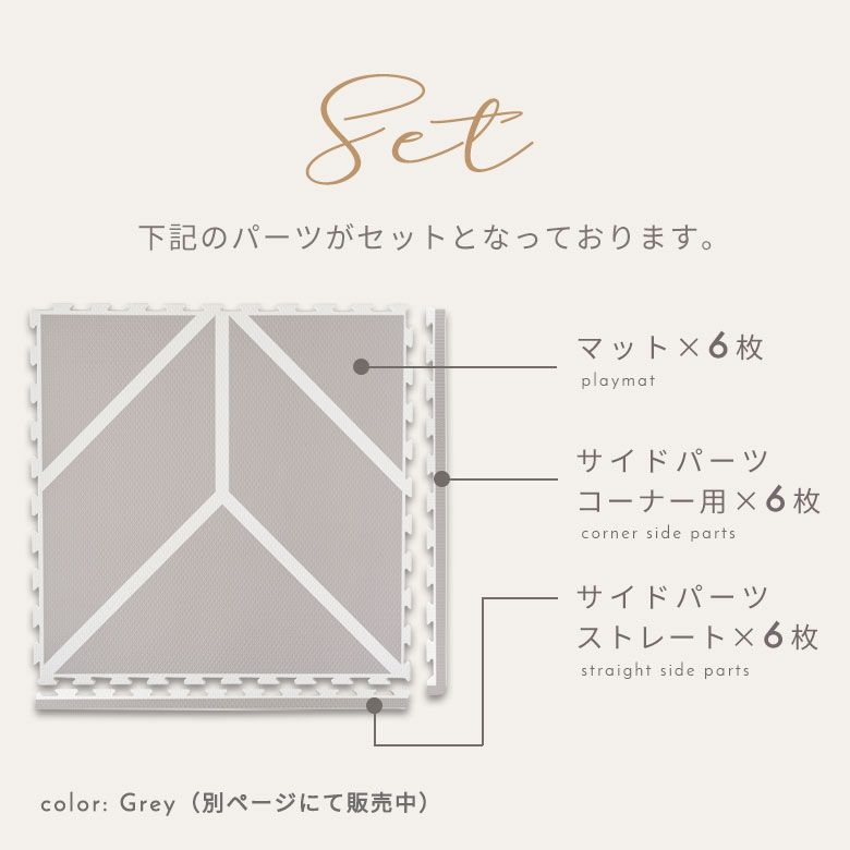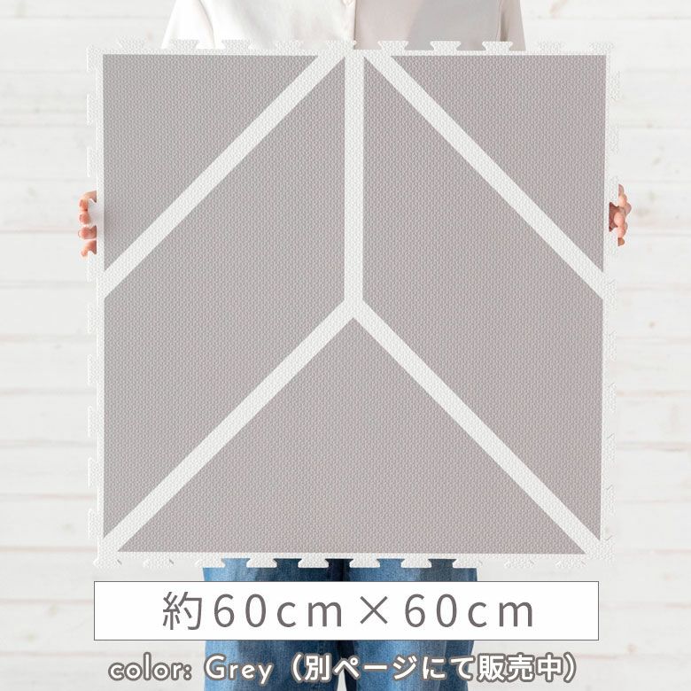 お部屋になじみやすい、ニュアンスカラー 1枚あたりのサイズは、約60cm×60cm。 こちらの商品のセット内容。パズルのようにはめ込むだけ。セット別の面積比較