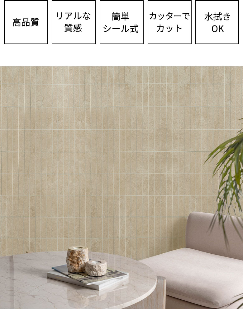 特別な道具や技術がなくても貼るだけで実現する、手軽さと高級感が魅力の「PREMIUM TOUCH -プレミアムタッチ- ウォールデコレーション」シリーズ。 上質さが漂う素材と、触れた瞬間に伝わるリアルな質感は、空間に“プレミアムな仕上がり”をもたらします。DIY初心者からプロまで、誰でも簡単にワンランク上の空間演出を楽しめる新しいタイルシールシリーズです。