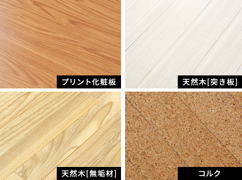 ウッドカーペットの表面材にはいくつかの種類があり、それぞれ見た目、耐久性、価格が異なります。